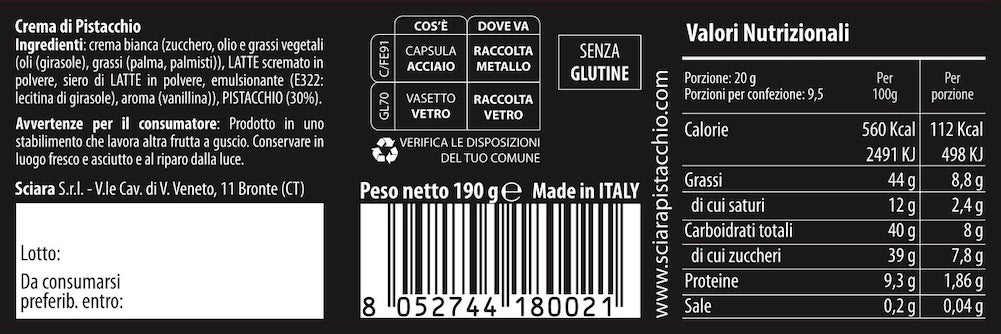 Sciara's "La Classica" Pistachio Cream is made without the use of preservatives or colourants , with a base of creamy white chocolate and the unique taste of Pistachio.
